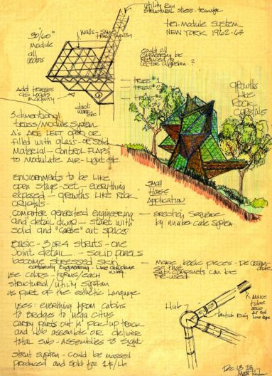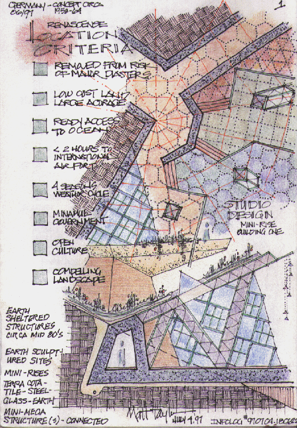 The second one is the mountain retreat rendered in circles spilling down a terraced hillside. While less radical in concept and easily imagined my Wrights work from the late 30s to his death in 1959, this concept still has a unique an intimate sense of the quality of personal living space which has been rarely accomplished and is almost totally absent from architecture today. Her interlocking and cascading circular forms have been the frame work of many of my designs from the Cooper House of 1958, to an actual proposal for a resort I made in 1962 and inclusive of numerous navCenter designs built and un built from the mid 90s to today. |