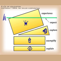 working separately or together. The Teaching Modalities Model describes a systematic system for individual learning, peer group leaning and work as an integrated lifelong experience. The 4 Step ReCreation Process Model show the transitions as idea becomes reality. Learning and creativity are essentially the same processes. Learning is creativity aimed inward at self development. Creativity is learning aimed outward at making something - self expression. Both are transformational - they require recreation. Notice that what we call today, recreation - which is often aggressively mindless - is a distortion of the true meaning of the word. The Five Points of Mastery Model expresses two important aspects of learning: that the teacher and the student are both learner and teacher, respectively, and that they have to accomplish competency in all five mastery roles in order to become a true lifelong learner. |