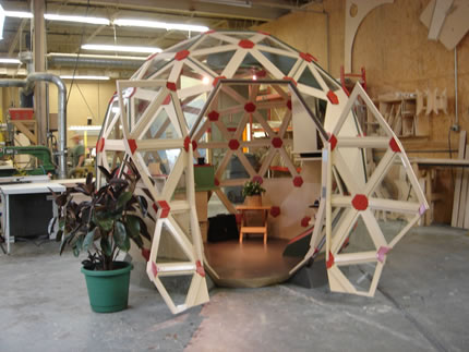 | The production version of the mediaPOD is, of course, is conceived to be more finished and sophisticated than what we accomplished with the MULE [68] which was essentially a study using inexpensive materials in order to demonstrate its interior space and get feedback on how to configure it for its first intended use. Given this qualification, the essential character of the POD can be seen. It is clear than it presents a new geometry and symbol - with many social connotations - in the Taylor kit-of-parts. It will allow a closer packing of PODs than other forms and it will require more intensive landscaping to best make use of the negative spaces thus created. For those not familiar with “negative-space,” as a term-of-art, it does not meant negative in the sense of “bad.” Just the opposite. The negative space in architecture is that which remain if the solid objects are not the focus of attention. This is actually the most subtitle yet provocative aspect of space in the architectural art [69]. The pure geodesic geometry brings a synergistic mix of both simplicity and complexity to a space. It creates a strong comforting sense within its own interior. The interactions between its outer shape, and the other elements making up the environment around it, are intrinsically dynamic yet more complex to deal with than conventional forms. The mediaPOD will provide a new level of spatial complexity to our interior landscapes as well as an enhanced ability to play with scale within them. |