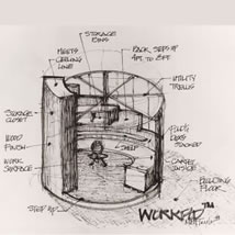 The first POD design assumed simple fabrication methods and focused on providing the maximum amount of work top and storage in the smallest diameter possible. It was to be built totally out of wood to give us the most control over both production and “look.” A turntable was considered which is the reason for the raised step. The design had a pocketing, slider door of wood or glass for privacy.