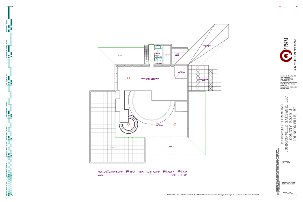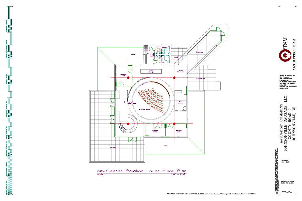 | To the left upon entering the Main Room is a Kitchen-Food Service area suitable for supporting user teams and catering large events. On the right, through the exterior wall is access to Restrooms from the Main Floor and the Balcony level. The blue zones on the left and bottom of the drawing are Learning Rooms defined by folding wood and glass doors. These can be configured in a variety of ways. The green zone shows the 24/7/365 access, from the Entry and CyberCafe, to the Restrooms and Kitchen-Food Service Area when the Commons is “closed.” The Library is built into the circular stairway to the Balcony Bridge which also holds private work niches. The remaining (white) areas are employed for a number of uses: smaller breakout- team work areas, KnowledgeWorker stations supporting events, display of work produced and study materials, knowledge-kiosks and so on. These areas and, their WorkFurniture, will be rearranged continuously as the learning work tasks change. The trade-off factors in how these areas are built are cost, flexibility and quality. For example, it is less expensive to make some of the Learning Rooms walls out of built-in-the-field, steel stud and sheet Roc construction. However, flexibility is lost. Clearly, folding wood and glass doors are more expensive yet offer greater long range returns. In DD, we will offer these tradeoff and the Johnsonville Team can choose what is the best mix. |
