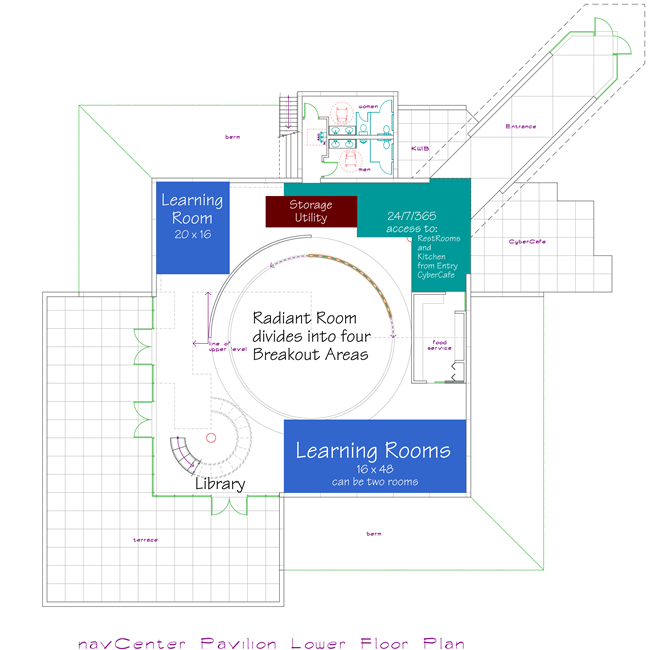 | The building, except where the Entry, CyberCafe and Restrooms protrude from the Main Room, is protected by a seven and a half foot wide and high planted earth berm with the exception of the Southwest corner which has a Terrace for sitting, reading, dialog and team groupings in good weather. Pavilion is designed to embrace the site and to feel open and “warm” throughout the four seasons. Its use of light, shade and shadow, open and closed views, keeps user’s sense of season and time of days acute. |