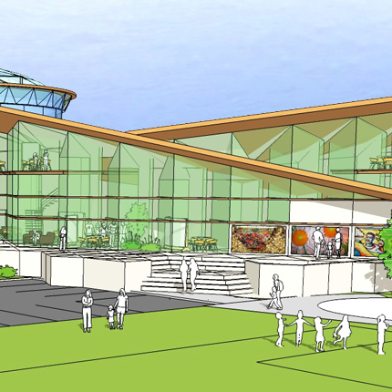 | The HUB is the physical, technical and Media Center of all three of these zones. The HUB is a theatre in the round, a conference hall, multimedia creation and playback lab, stage, and gallery. All of the buildings, existing and new, intersect with the HUB and have direct access to it - even the High School which does so via a sitting area-gallery-walkway. The HUB is used both by the School and the Enterprise separately and together for teaching, presentations, media shows, plays, music performances, large group dialogs, report sessions in DesignShop™ events, multi-participant conferencing and complex Internet searches. |
