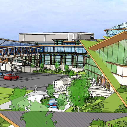| The expanded Campus after Phases II and III will have the capability to do very large scale events. The end result of the finished Campus is equal to a significant convention center. As many of the learning areas will be large and equipped much as a navCenter and it will still be possible to set up the GYMs as collaborative spaces, large scale DesignShop™™ events will be possible. This can be programmed when school is out. In cases like this, controlled access to the Campus is both necessary and possible. Most attendants will be from out of town and hotel vans can be employed. The parking garages will be designed to have level surfaces and with higher than normal ceiling heights to allow van access. This to makes convertible space in the case of a future with radically different transportation modalities. |
