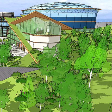 | The Enterprise Wing is over a two level covered Parking Garage one and a half stories into the ground. North of the Playing Field there is an outside Entry and Terrace which is accessible from the exiting grade level Parking Area and a turn-around driveway which is connected to the underground parking entry and exits. The entire North side of the Enterprise Wing has earth sheltered berms and planted roofs presenting a landscaped “hill” to the North and the East side of the Enterprise Wing creating a visual and sound buffer between the school and the residential neighborhood. When the landscaping is complete, the building will be barely visible and the view from the Campus - which has no intrinsic merit and a great deal of ugly and noisy - will be screened by layers providing an “infinite” space and sense of onsite refuge. |