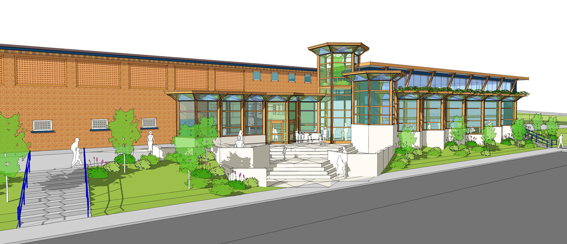 | This phase I Option solution, we call it the Steel Cube building, employs a simple, two story high “big box” steel structure providing the largest amount of cubic footage possible for the least amount of time and cost. On the outer curtain wall faces, the Phase II grammar is integrated and the interior space will be developed from this module inward. The Steel Cube building can be laid out and built in such a way that the Phase II second story addition on the West side of it can merge into it and the future Phase III Hospitality and HUB structure can be interlaced with it in such a way as to form an integrated whole. This design was one of Adam Mcintyre’s first Phase I solutions. |