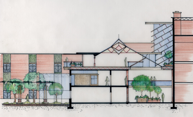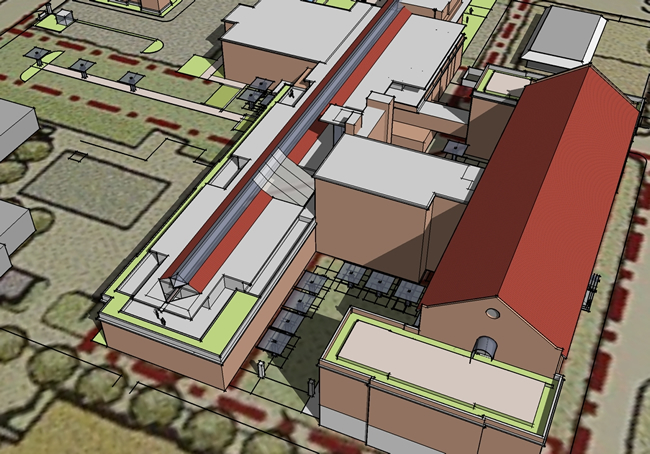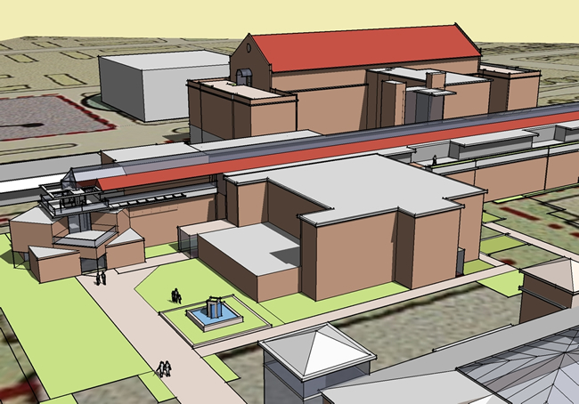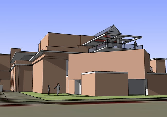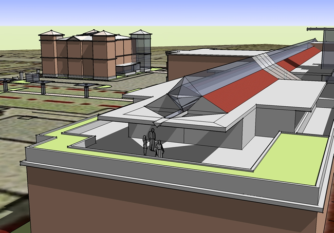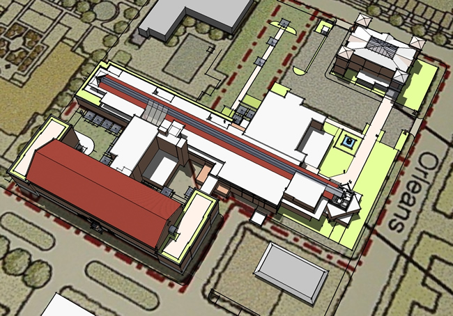 When fully developed, there will be 140 years of school architecture on this campus. While preserving the heritage of each piece, the whole must be integrated, function well, and meet 21st century requirements. The development of this campus is proceeding through several stages. The attitude embedded in this process is to build and maintain for the long term. These are not seen as buildings of small value to be used and then discarded. The idea is to make them, first usable (Phase I), then provide a modern infrastructure throughout the campus (Phase II), add carefully selected functionality (Phase III) and then maintain and upgrade. continuously. applying a systematic, long term, process. The goal is to create a compact - four acres - environment of study, learning, collaboration and community engagement - all key aspects of the Sojourner Douglass vision and mission. This intention leads to certain architectural problems and opportunities. Already on the site are three existing buildings each of a different era and character. It is Phase III, that the major new construction will take place. It is the task of this Phase not only to greatly extend functionality but to provide the integrating force that brings the whole into harmony. It is also the goal to provide far more amenity than buildings of this type usually render. Utilitarianism is rejected by this approach. It is believed that an environment of beauty and grace is a positive aspect of true learning and that the artifact of the built environment is an accurate reflection of the values and abilities of those who build and use it. In this regard, the act of building is not separated from the process of using; nor, is it unrelated to the development of the institution as a community-of-practice. Education means “to lead out.” It is the creative process aimed at the development of the human. Architecture shelters, facilitates and symbolizes the human - it is not merely the act of keeping out the rain; it is the act of expressing the soul while keeping it dry. A society that does not know it’s origins and history has no future. Architecture that does not respect and develop it’s past, as it simultaneously forges new perceptions of the possible, has no future either. How each piece of this campus is kept individual and made one is an act of philosophy, a task of design; and, the artful exercise of economics. The great theme of our present era is the dematerializing of thing-ness. Knowledge - the great value add - is becoming ubiquitous and transparent. Relationships are also changing their form. It will not be globalization versus local communities, it will be the weaving of many ValueWebs, each distinct, each spanning a globe, each a specific fit for a community of individuals. The heavy hand of 20th Century organizations will give way to networks of people and resources based on mutual values, respect and gain. Technology also will cease to impose itself on life but will become the silent and transparent human augmentation tool it is meant to be. Out of the shadow of the industrial era, a new organic way of living and working will emerge. The exiting structures are built of brick and heavily massed forms. The 1869 and 1923 buildings are beautifully detailed and reflect an attitude about the social value of education that is, unfortunately, long gone. The 1969 building, while well built, expresses the late 20th Century values of conformity and mass one-size-fits -all solutions. It is this building that will be modified the most with the addition of a lightweight, transparent third story structure that terminates with the Restaurant presenting a new face to the community. The old construction is rooted in the past and expresses those traditional values that are always worth keeping: solidness, being anchored - the tradition of hand craft. The new will show the proper application of design technique and advanced materials. It will build on the past; it will soar, connect everything and aspire; it does not protect by force - it is the reality of reciprocation. Institutional buildings most often keep nature out. They isolate in the name of practicality. This is a false utility. The acreage of this campus will become a garden; the building will embrace a renewed urban landscape. Density of use and nature will be made harmonious. Natural light will be brought into this place of innovation and collaboration; an elevated view of the city-as-prospect will be provided. The existing buildings built for one purpose, now gone, and poorly adapted over the years, will be restored to a new life; the new constructs will be adaptable and multi-purpose - they will extend the functionality of the old. The campus will support true economy - not a sunk-cost budget mentality. The buildings will pay back in human and financial terms for another century. The SDC Campus is located in an area of Baltimore that has long been economically marginal. 15 blocks to the South is the renewed downtown and marina areas. Directly on the North is the Johns Hopkins campus which is undergoing a multiple block expansion. SDC has deep ties to the local community. The development process of this campus constitutes a new model for renewing the urban environment. The campus will promote and support community development. It will exemplify what it teaches. This is an essential integrity. The architecture has to express identity, unity, security and openness; and inclusiveness. The Orleans Street side - the new campus “front” - houses the public functions of the college: Fine Arts Center, Restaurant, Entries to the Conference Center and Residency. This is SDC’s presence to the community. Through this portal, controlled access is provided to the Administrative Offices, Academic facilities, Collaborative spaces, Student Union, Gymnasium, Book Store and other support services. This is a layered approach to open access and gated security. Because of the immediate environme