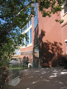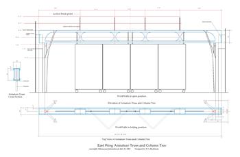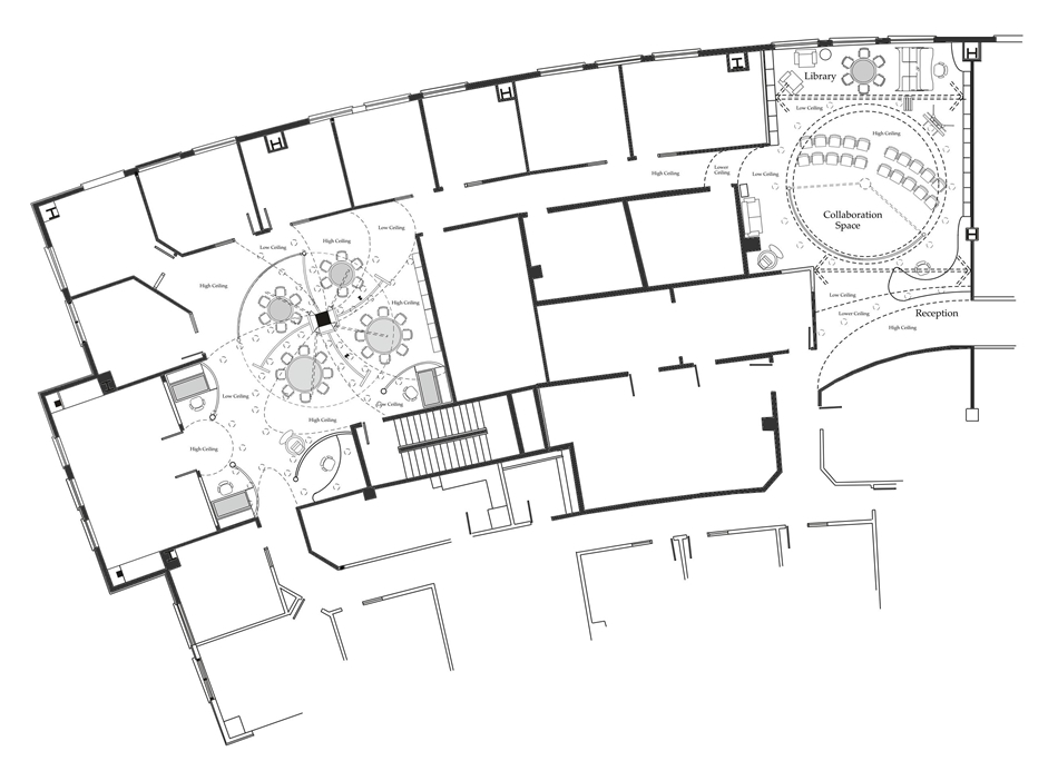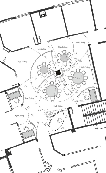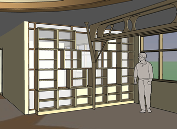 The from the Radiant Room area toward the bookcase-glass wall adjecient to the | | | |  | The South side of the Lobby opens to a shaded Patio overlooking a creek. This is a pleasant area for sitting and Talking. | | | |  | The foot print shows the quality of light from the North, West and South. | | | | | Description, Philosophy and Grammar | The principle character of the Collaboration Space space is defined by the play of ceiling levels in counterpoint to the pattern of the flooring, lighting and Armature elements. Three window provide North light. The West wall (at the North end), between the NavCenter area and the Video Design Room, is composed of clear and translucent glass, and articulated book cases to provide more light, transparency and openness. | |