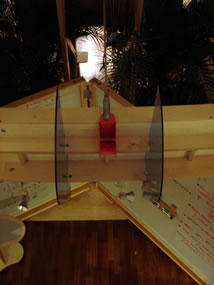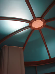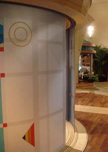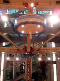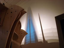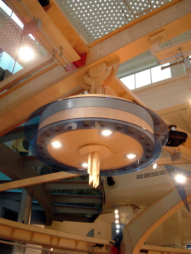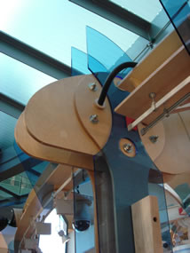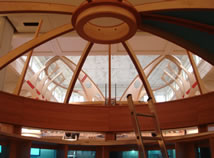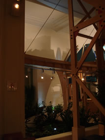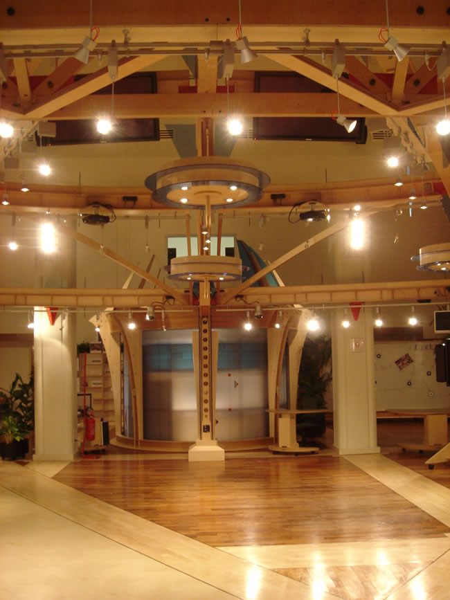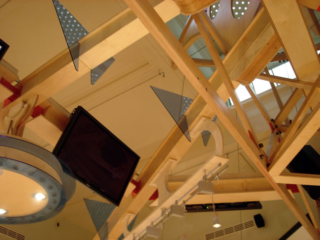 The simple truss is composed of two truss systems which bisect the grand hall under the original concrete and glass dome - one of the first of its kind. This truss carries the majority weight of the 20 meter span of the Armature. It is the main feed and home run - through its feet - of all wires running to various panels in the basement. Completing the longitudinal axis, and supplying lateral support, are three arches on each side of the Truss. These come down to six columns. On top of the truss rest 10 cantilevered arms which support two curved beams over which the wire rope of the suspension system run to support the outer ring of the Armature. These wire ropes terminate at a compression ring which ties the two simple trusses together and supports the ends of the six arches. As this is the center of the span - the place of maximum deflection - the weight of the outer ring is transferred to this point as tension thereby resisting the deflection. In the resolution of the stresses, the major elements of the Armature collaborate - the bearing is distributed to 22 points on the floor with a bolting pattern designed to resist twisting due to earthquakes. Other than the floor bolts, the entire Armature structure is free of the original structure, embracing it yet not tied to it. The Armature can move in response to loads, it can distribute its stresses, it is flexible and strong, it can be modified to accept new technology and display elements. It is a composite of engineering history. It is 90 percent built of simple birch plywood pieces weighing a few pounds. Yes, a metaphor for why the navCenter is there. |