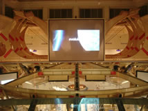 There are several new - not in concept of a NavCenter as it has been since 1982 [link: there to here], but in built reality - capabilities in this NavCenter. This environment is both an intensely physical and virtual place. It has a strong architectural Armature that is is also a multimedia delivery system. The Radiant Room can hold 300 people, and the space around it an additional 200, yet a team of five can be comfortable, and work effectively, in this same room without felling lost. To use this space requires active interaction and participation on the part of the users. This is a designed-in feature of the system. There are 400 lights in the main area - each are individually controlled. There are 40 video displays with up to 8 different content feeds to each one, a sound system that can move the building, sound pickup, remote and hand controlled video cameras and, of course, plugs for electricity, media and computers. The work PODs have turntables for floors, multiple layers of translucent, sliding screens and “sails” overhead which open and close. There are over 1,500 meters of wire in the Armature to prove power, signal/message I/O and devise control. The WorkWalls and Furniture roll, fold, and configure in a wide variety of ways. This environment has both presence - it makes place - and flexibility - it can be shaped by the users at a detailed level in abundant ways. This shaping ranges from plants, workstations, small and large wall components - such as curved WorkWalls 9 meters in length - to the nature, “shape” and content of images, light and sound. All media is multimedia: hand written notebooks, graphics on paper and WorkWalls, models, electronic content in various applications and works of art - all capable of being “mixed” and displayed on walls and screens.