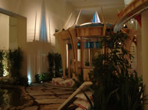 There are, within the main space, six major zones, each with a distinct environmental character, and multiple sub-zones within each: The Radiant Room, the Hallway which surrounds it, the Garden, two Balconies and an Alcove area below one of them. These spaces flow into one another - take a few steps and you find yourself in a place with a distinct feeling and function designed to facilitate a specific set of mental modalities and activities. |