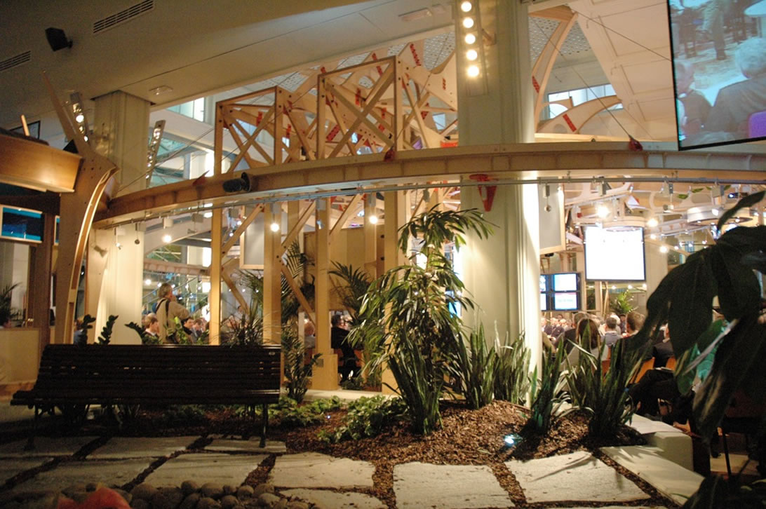 The Armature as expression - as a metaphor - derives it theme directly from its place and use. As an environment of learning and collaborative design, and as a significant meeting place in the city of Turin, the navCenter delivers a strong message about the essence of technology, engineering and the transition of this region of Italy to becoming a key player in the global 21st Century design economy. The Armature is made up of three integrated yet distinct structural elements: a simple truss, arches of a dome, and a suspension system. These three elements combine into a mutually supporting composite structure. How this is done it totally exposed to the eye. The total structure is an “open book” of three historically predominate structural forms. Every piece, bolt, clip and wire is exposed while the composition adds up to a statement of shelter, prospect and refuge, and PLACENESS - a high variety landscape for human interaction. All the while, this organic forest of wood fits into and supplements two other historical architectural idioms - one a 19th Century masonry building, one a 21st Century structure of steel and glass - the three together making one integrated architecture. |
